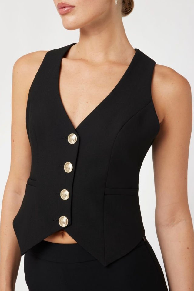 Streç tüvit kumaştan kolsuz, V-yaka yelek.